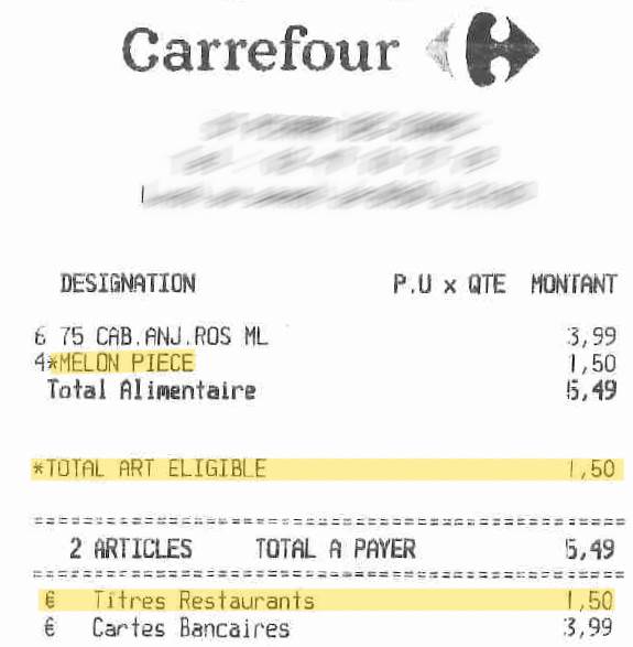 Par exemple, sur le ticket ci-dessous, on constate qu’une étoile précède chaque article éligible aux Titres Restaurants :